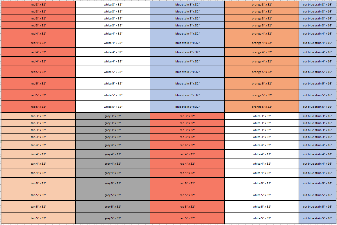 Color reference by tree species Ready-made packages of boards bundled by color.