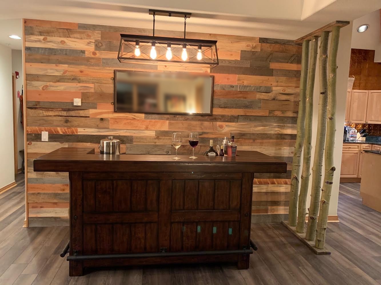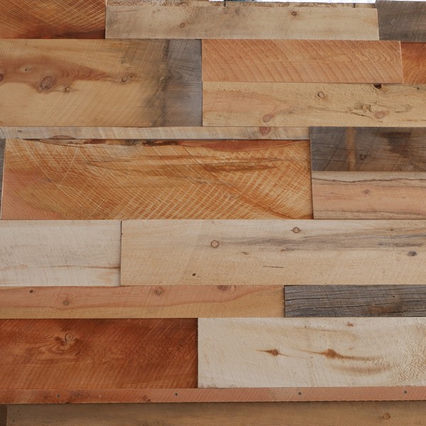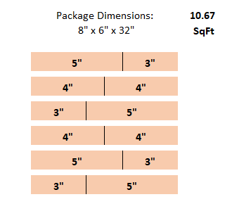 Accent Wall bundles are bundled in 8"x6"x32" packages, sorted by color/species. Bundles include assorted width boards totalling 10.67 sq ft per box.