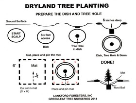 1. Install ways to catch water for each tree. This is the key. You can dig trenches with a tractor, planting in the lower part of the ditch. Or dig large circular "saucers" in the ground, berming 6" up in a wide circle around each tree -- the larger the circles the better -- we like four to six feet. Get the center of the circle to be 6" to 12" below what was the original ground level. Then, when you can afford the material ($3 to $5/tree -- call us for source), add a "weed barrier mat" of woven landscape cloth, held down with turf staples, and slit-cut for the tree to poke out of in the middle . The idea is to catch rain .and snow, and direct its flow to the tree in the middle of the saucer/ mat. Think of how the water will be caught, and optimize the position of the saucer and mat.